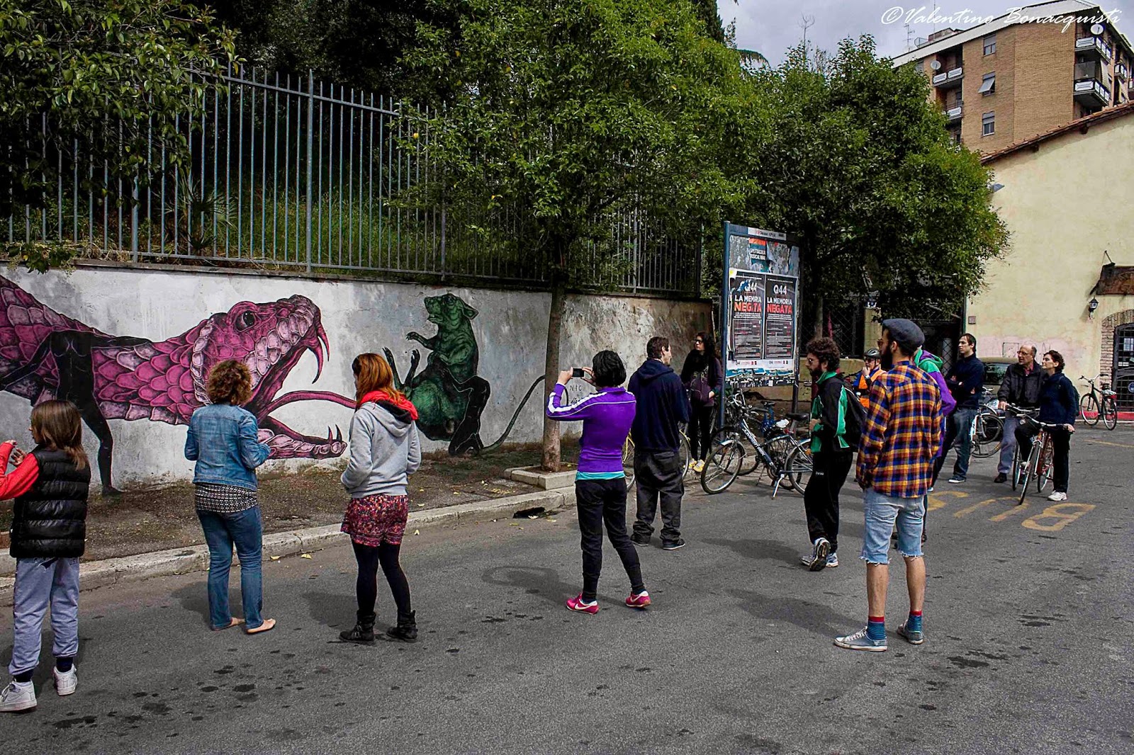 PuntodiSvista (click HERE to visit Gazebike website). It is a real bike ride amongst the MURo murals to discover the neighborhood and its main points of attraction: the working-class suburb called Quadraro that becomes a ‘village inside the city’ and it’s going through a moment of overall recovery and re-evaluation of its historical and social aspects. The tour starts in Tor Fiscale, a small green area full of historical and archaeological sites, and we will ride up to the Quadraro, where the guide and artists’ assistant Giorgio Silvestrelli will explain the murals you will find along the way.